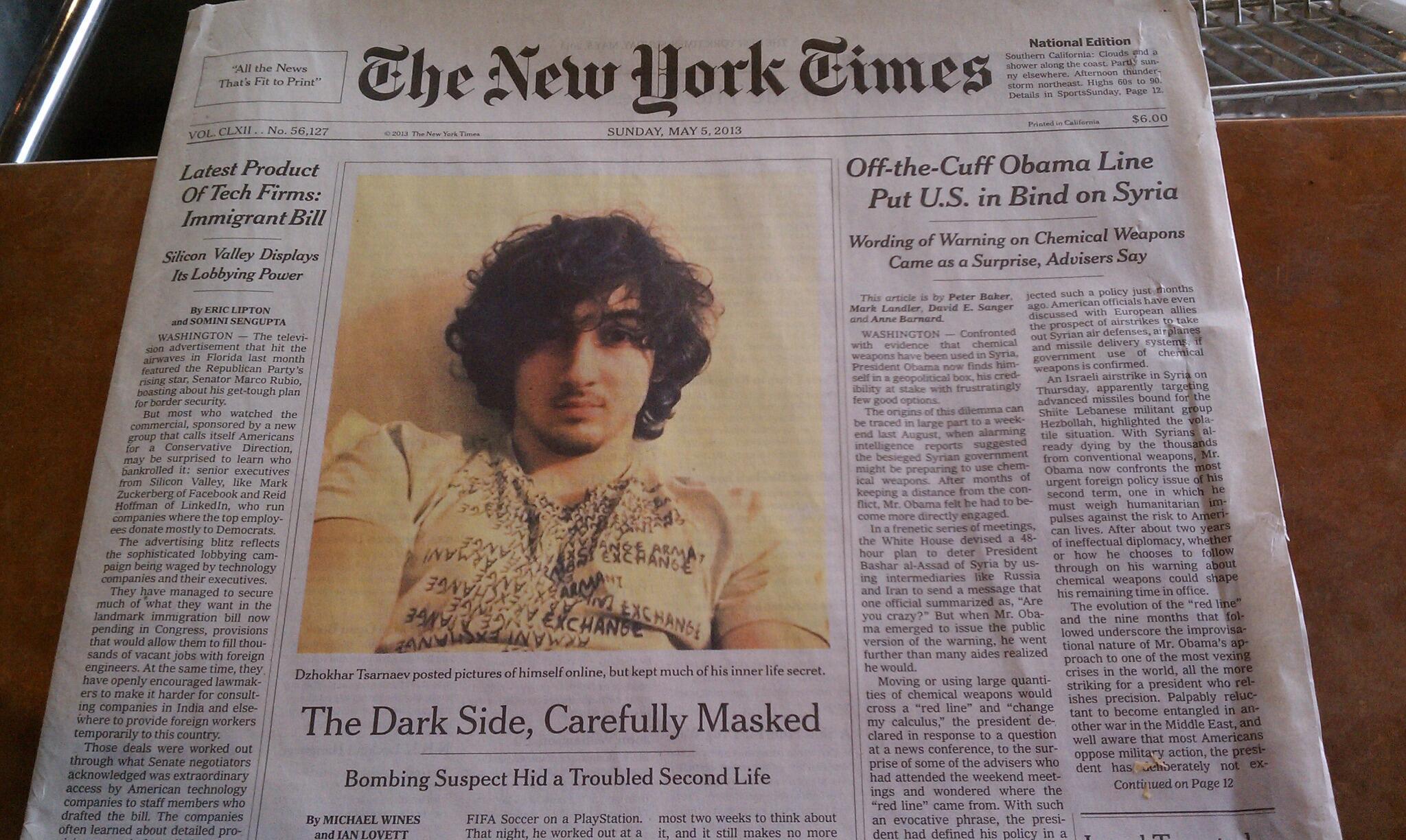 Others responded that the New York Times ran the same Tsarnaev photo on its front page without receiving the same criticism, and that portraying Tsarnaev as a teen heartthrob served to confound stereotypes of what Islamic extremism looks like. (The actual story on Tsarnaev by Janet Reitman has been praised as solid examination of Tsarnaev's life as a wayward American college student with only quiet hints of holding radical views.)